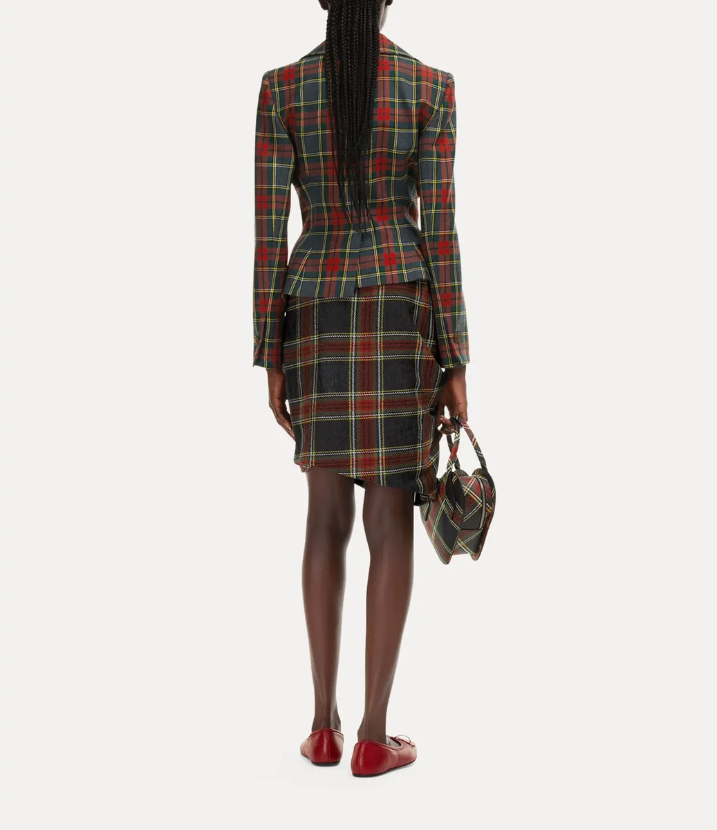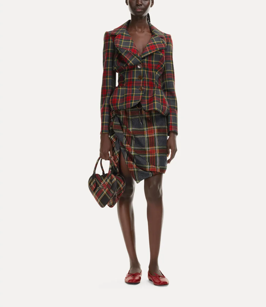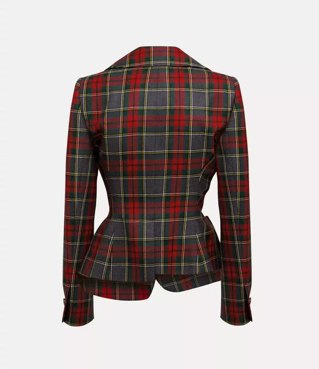 Notre veste Drunken utilise le système de coupe expérimental original de Vivienne, qui déforme les éléments du vêtement pour leur donner une forme presque surréaliste. Cette saison, elle est proposée dans un tartan « Scarlet » éclatant, avec une fermeture à boutons sur le devant.