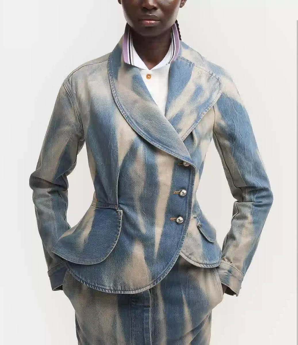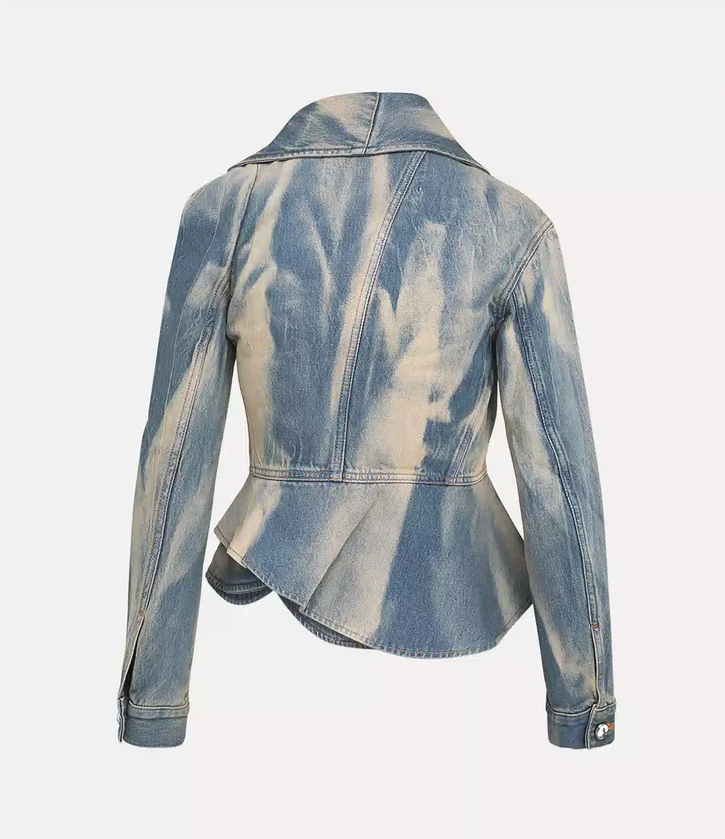 Confectionnée en coton doux, notre veste en denim Stormy présente un délavage blanchi et décoloré qui lui confère une finition vintage et usée. Le design se caractérise par son revers asymétrique exagéré, qui apporte une touche sculpturale à l’encolure, tandis que la taille nettement cintrée et l’ourlet évasé créent une silhouette définie et ajustée.