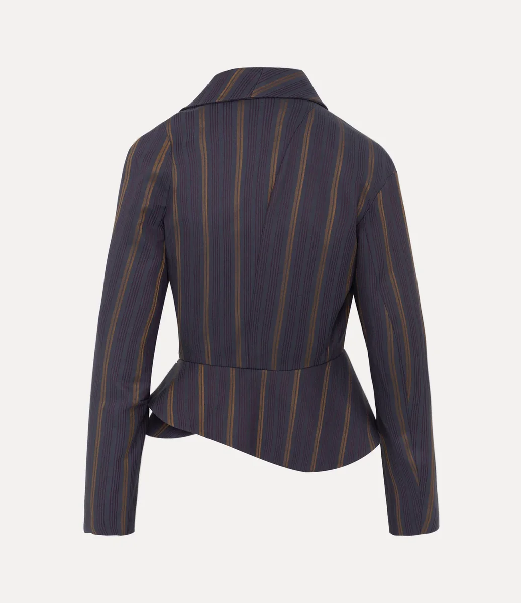 Confectionnée dans un mélange de coton doux, notre veste Stormy présente une base bleu marine avec de fines rayures verticales dorées et bordeaux, encadrées par un col châle drapé. De délicates pinces soulignent la taille et tombent en un ourlet sculpté, tandis qu’un motif ludique « Coffee Stain » accentue l’intérieur.