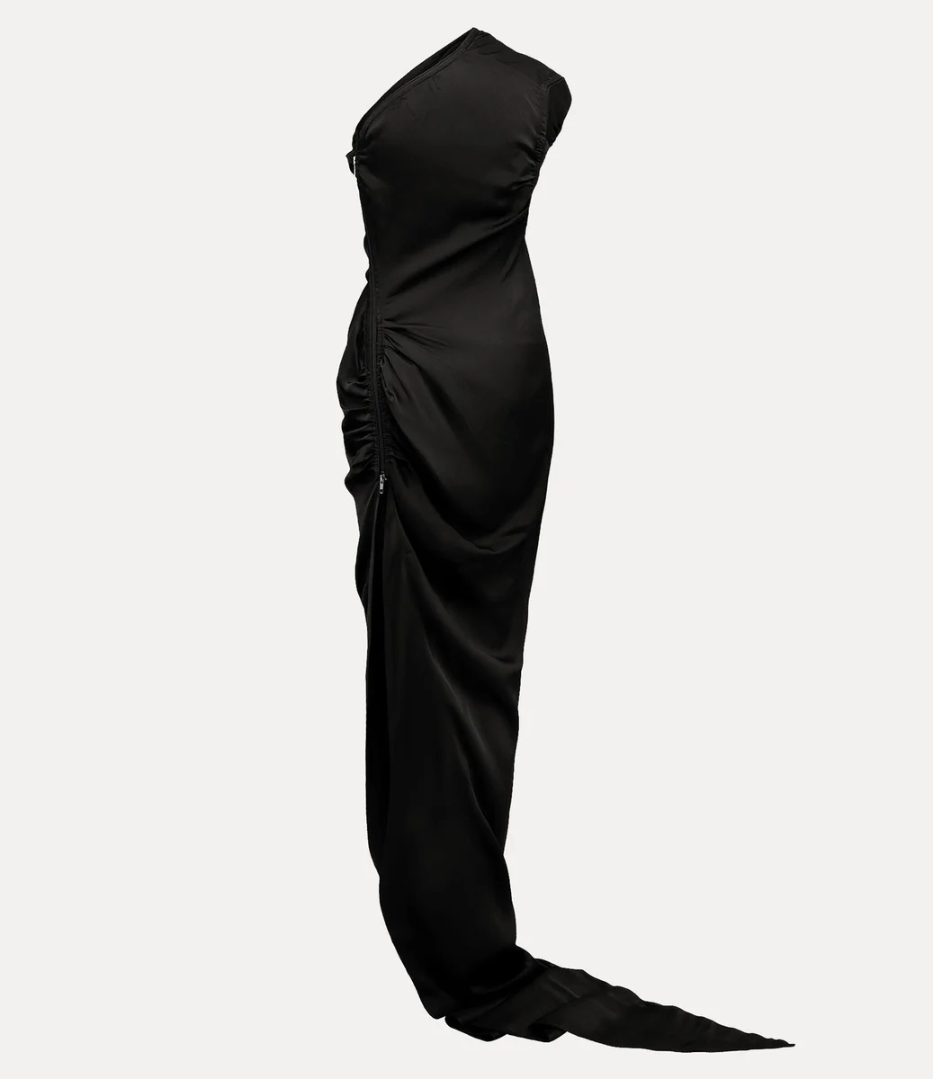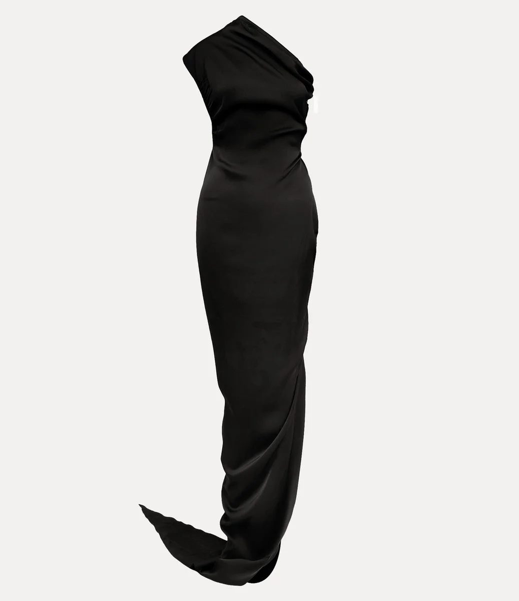 Notre robe Andreas se caractérise par son décolleté asymétrique, qui sculpte la silhouette grâce à un corsage ajusté et des pinces délicates qui épousent les formes. Sur le côté, de légers fronces rassemblent le tissu en un drapé souple, qui tombe en cascade pour former une traîne élégante.