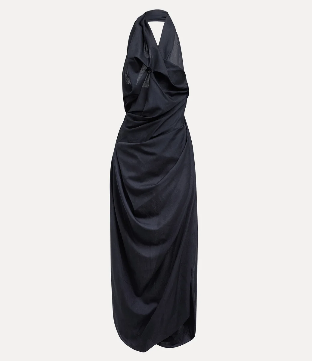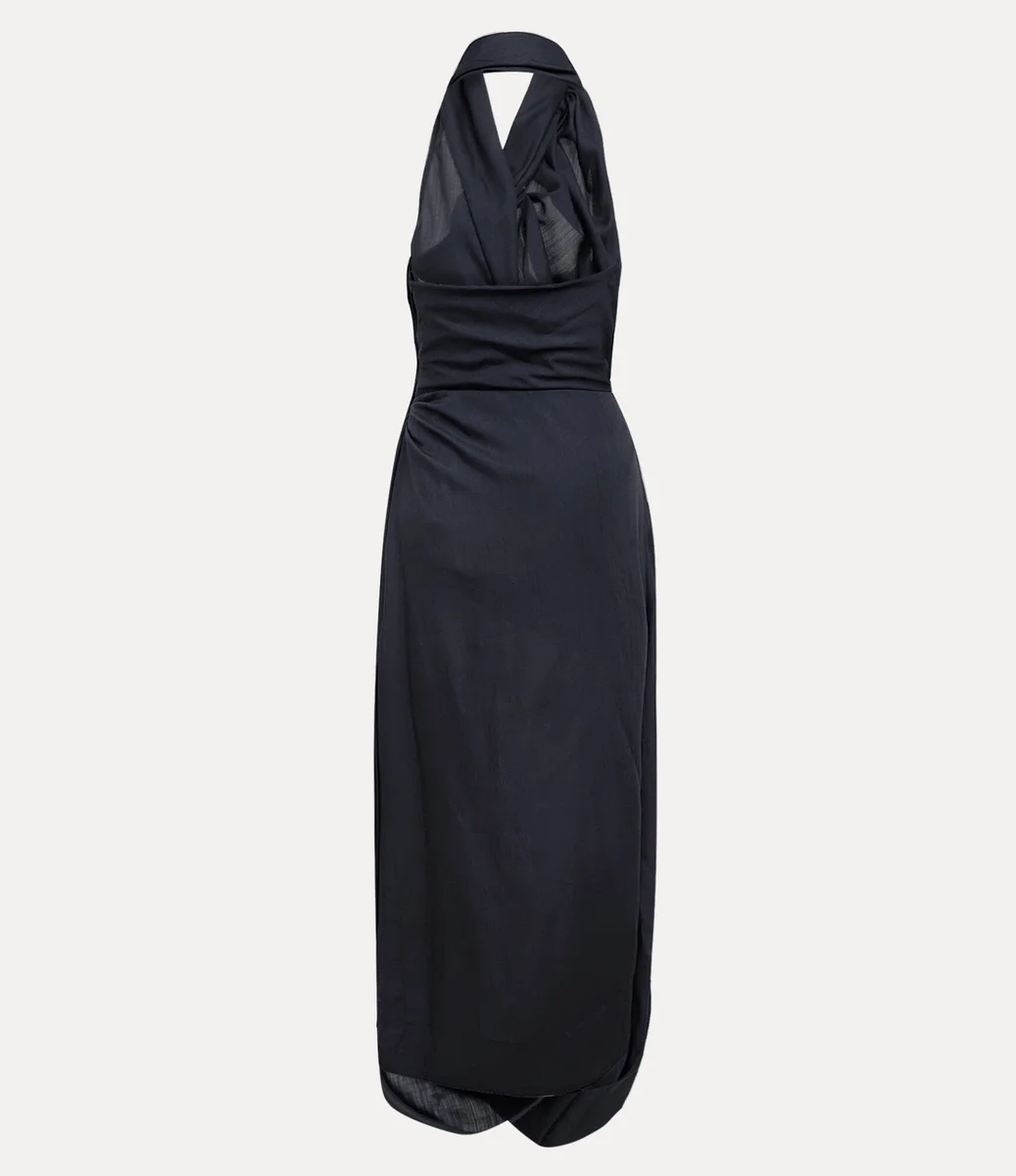 Notre robe Halter Galatea enveloppe le corps de délicates couches de laine légère et transparente, rehaussées de coutures torsadées complexes pour un effet asymétrique. Le décolleté raffiné tombe en plis profonds, se resserrant à la taille avant de retomber en cascade dans une jupe droite gracieuse.