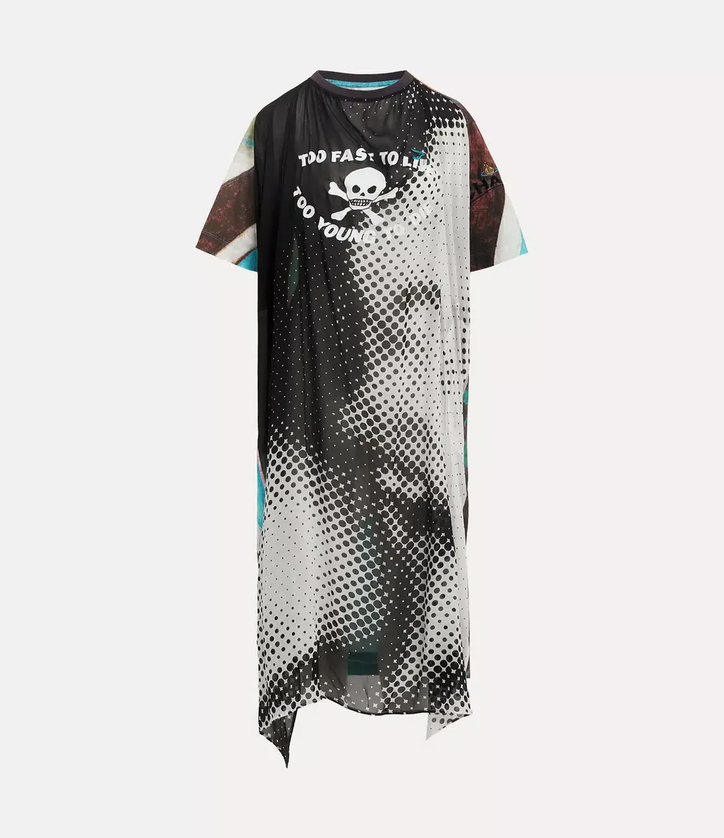 La robe Worlds End Swing est ornée du motif Union Jack emblématique de la maison sur les manches et dans le dos. Elle est complétée par l’emblème du crâne et des os croisés et le slogan « Too Fast to Live, Too Young to Die » (Trop rapide pour vivre, trop jeune pour mourir), tiré de l’enseigne de notre boutique emblématique, désormais connue sous le nom de Worlds’ End.