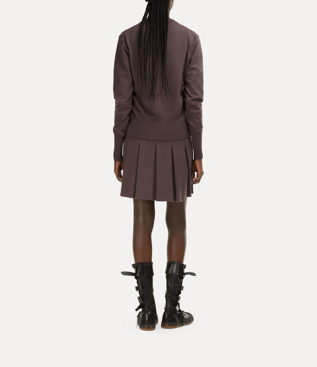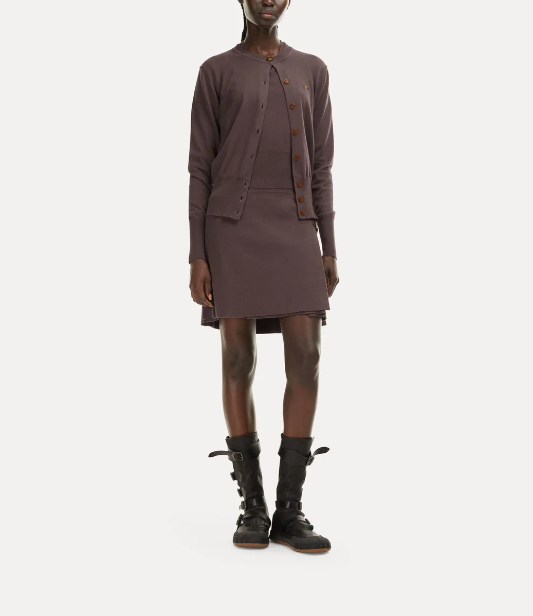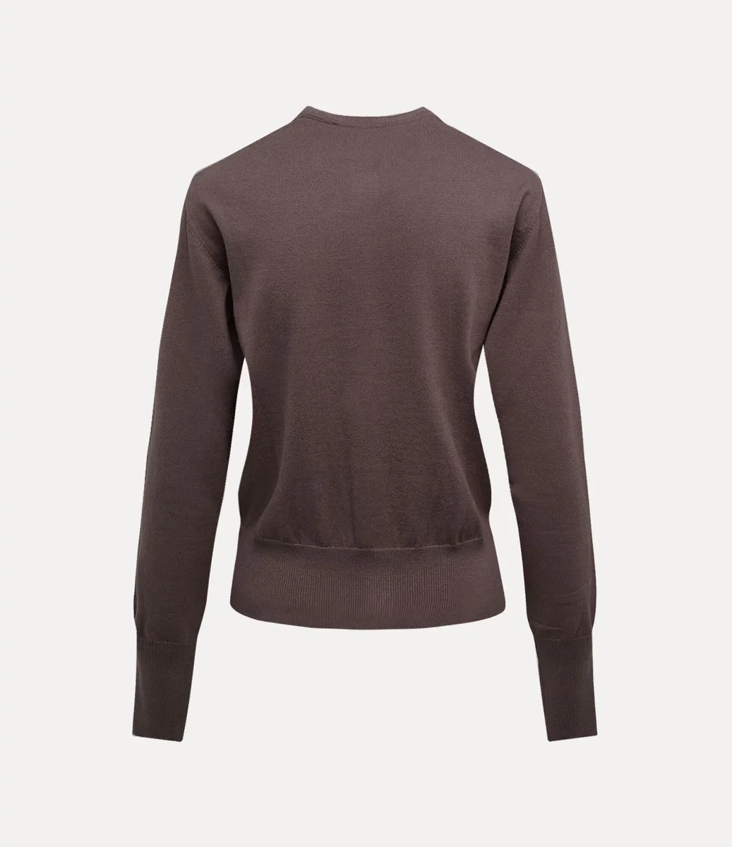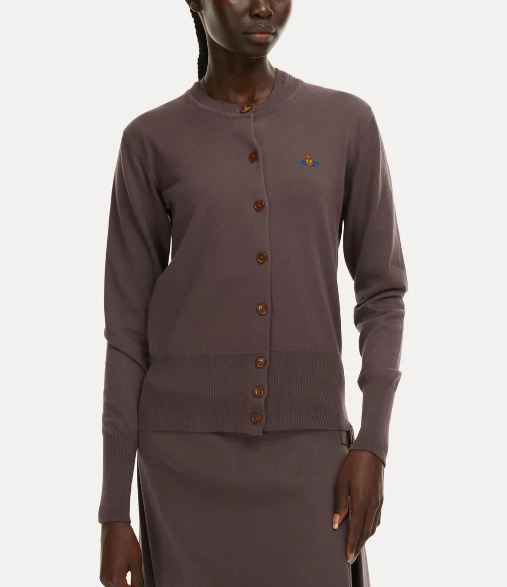 Notre cardigan Bea présente une finition en coton et cachemire, avec un col rond et une silhouette ajustée. Il est orné de nos boutons signature de couleur ambre, rehaussés d’un globe brodé sur la poitrine, symbole de la vision de Vivienne qui consiste à propulser la tradition dans le futur.