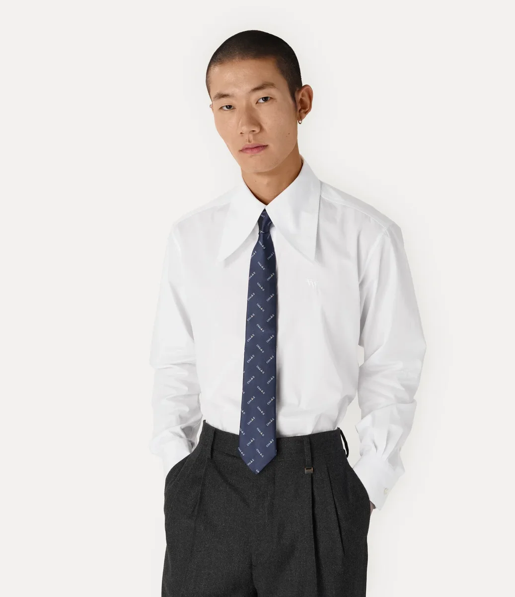 Notre cravate en soie présente une large lame qui s’effile en une pointe classique. Le motif est rehaussé du slogan « CHAOS », signature de la maison, répété tout au long de la cravate, capturant l’esprit rebelle de Vivienne et son engagement à remettre en question les conventions politiques.
