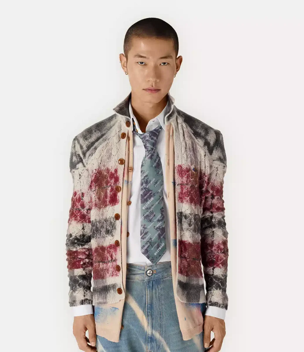 Notre cravate arbore l’imprimé Toile de Jouy emblématique, avec son motif pastoral romantique sur toute la surface. De coupe large effilée vers une pointe classique, elle est ornée du motif « Westwood » en lettres majuscules répétées sur toute la silhouette dans différentes polices.p>