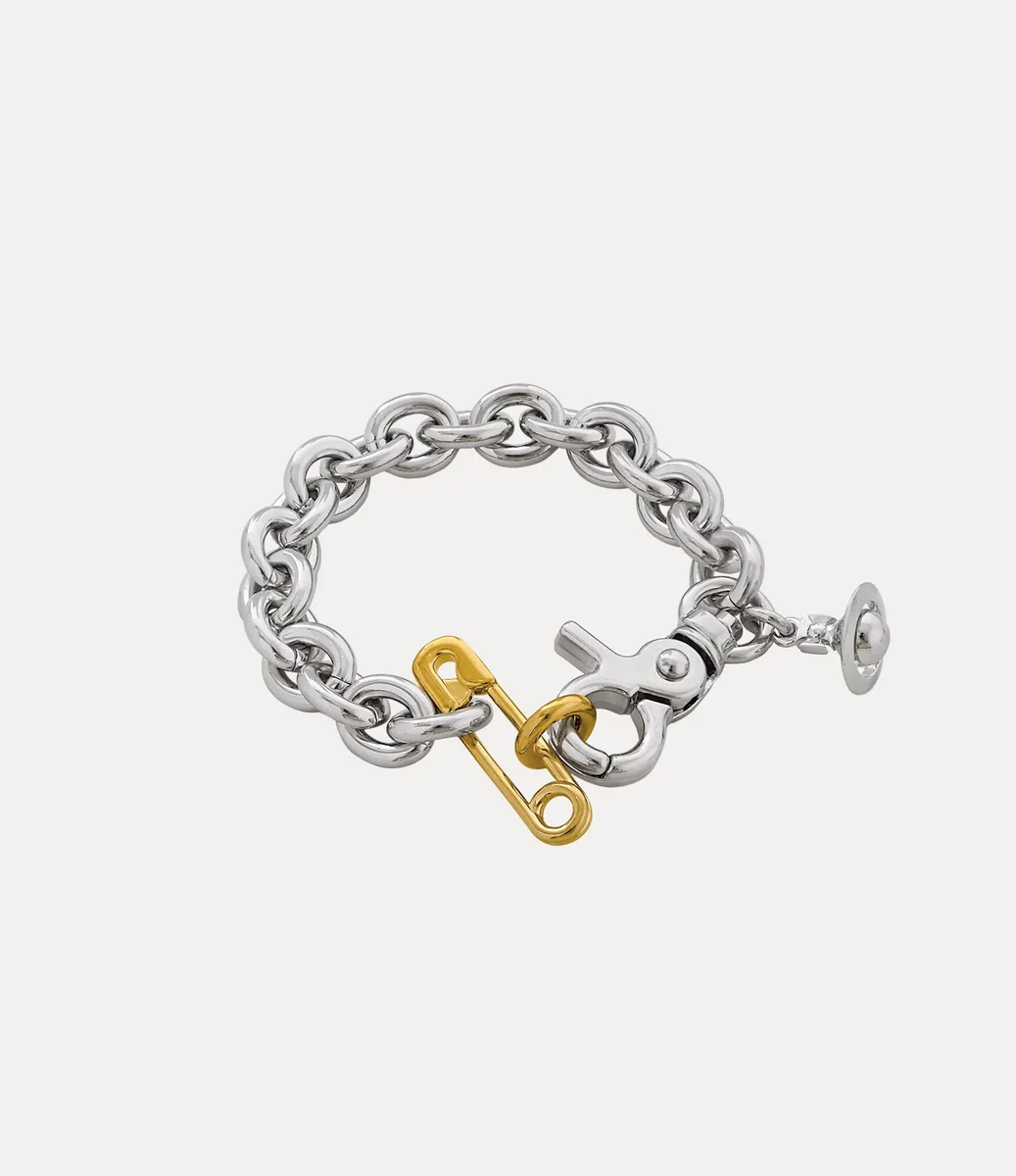 Le bracelet Man. Claude, conçu avec une finition argentée, présente notre détail signature en forme d’épingle de sûreté, un clin d’œil au style punk et non conformiste de Vivienne. Un charm métallique en forme d’orbe tridimensionnel est suspendu à la chaîne câblée robuste, ajoutant un aspect dynamique à la pièce, tandis que le fermoir inspiré du matériel permet une fermeture facile.