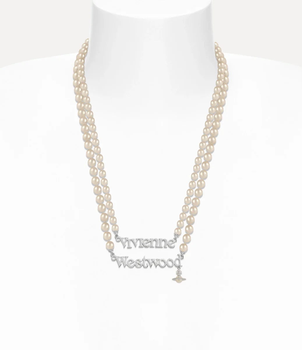 Notre collier Man. Emilio argenté est orné de deux rangées de perles Swarovski scintillantes, qui évoquent un sentiment de grandeur et de luxe. Au centre, le motif signature « Vivienne Westwood » est suspendu à un pendentif en forme de perle.