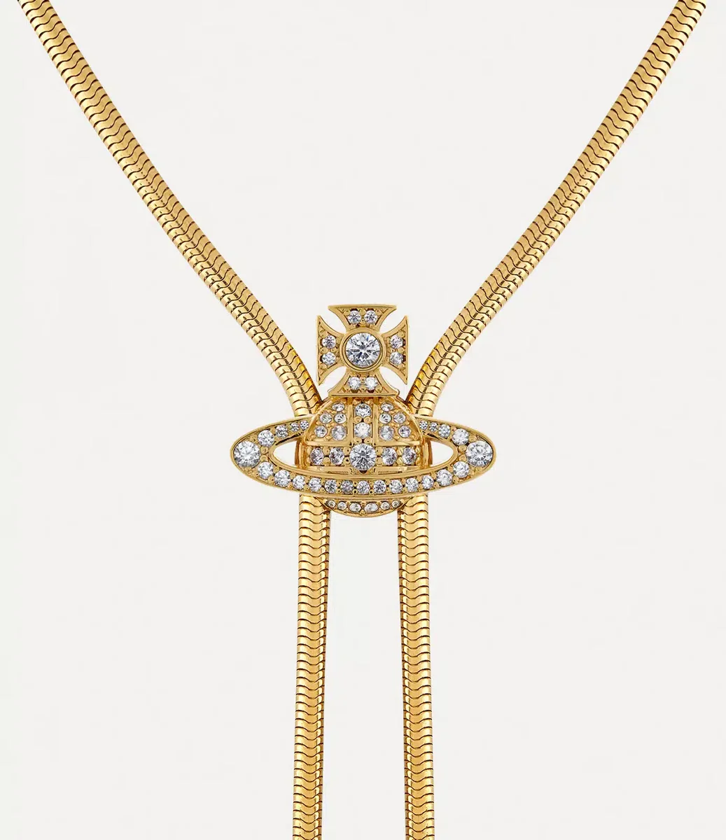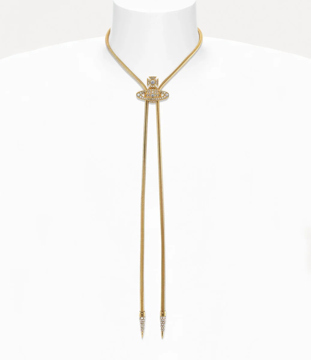 Notre cravate bolo dorée s’inspire du motif sphérique emblématique de la maison et est ornée de cristaux pavés. Dotée d’une chaîne serpent élégante et d’embouts en cristal pointus, elle peut être ajustée à différentes longueurs en faisant glisser la sphère centrale pour un ajustement personnalisé.