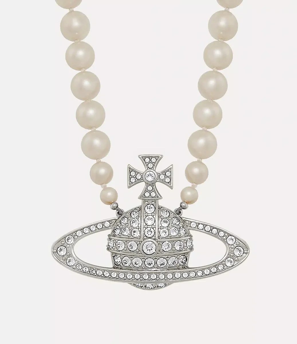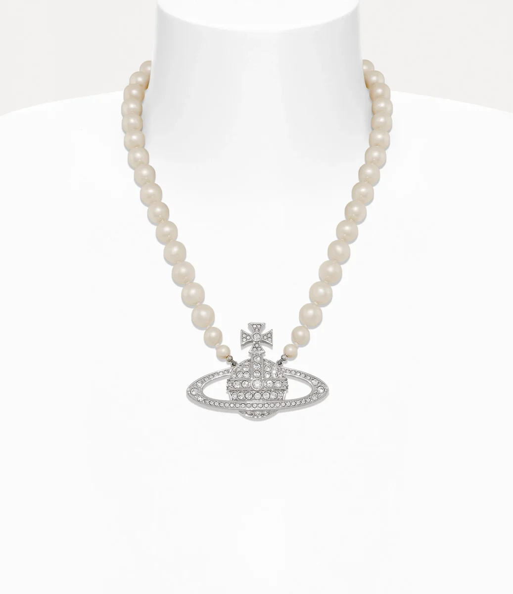 Les perles sont essentielles à l’héritage de la maison, évoquant un sentiment de luxe d’antan. Notre collier Man. Bas Relief Pearl présente une rangée de perles Swarovski nouées à la main, dont la taille varie élégamment, et est complété par un motif sphérique orné de cristaux au centre du design, synonyme de la vision de Vivienne qui consiste à propulser la tradition dans le futur.