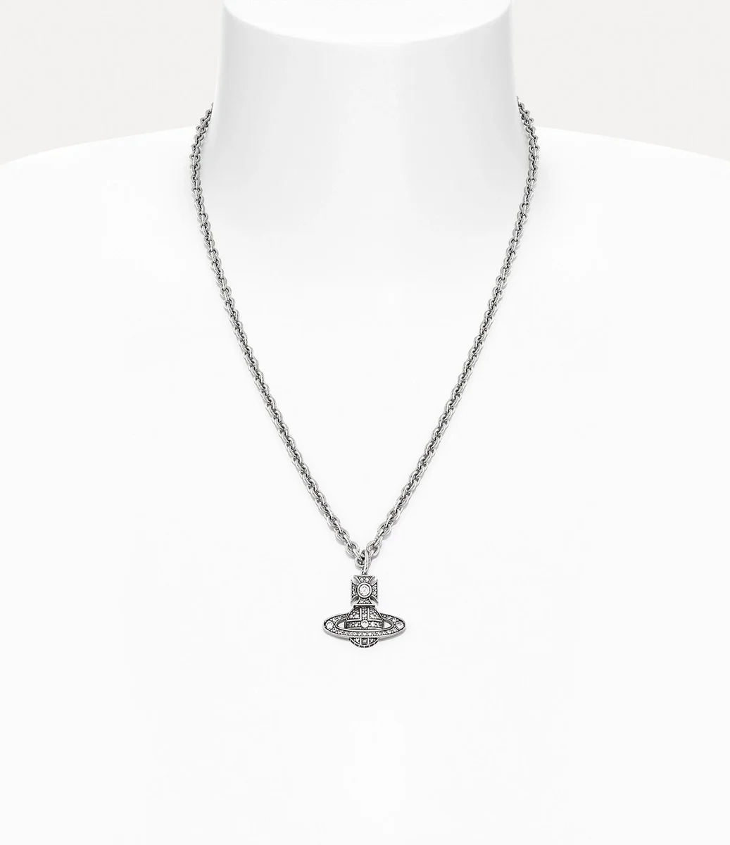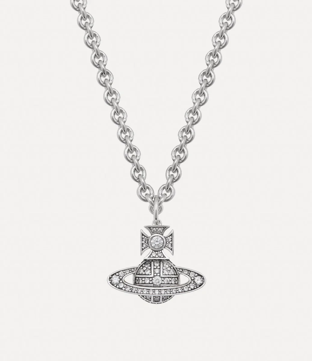 Inspiré par la vision de Vivienne qui consiste à propulser la tradition dans le futur, le collier Man. Carmela Bas Relief Pendant présente notre motif sphérique bidimensionnel signature au centre d’une chaîne à maillons épais. La pièce arbore des détails en cristal scintillants au centre du globe et de l’anneau Saturne, le tout complété par un placage argenté poli.