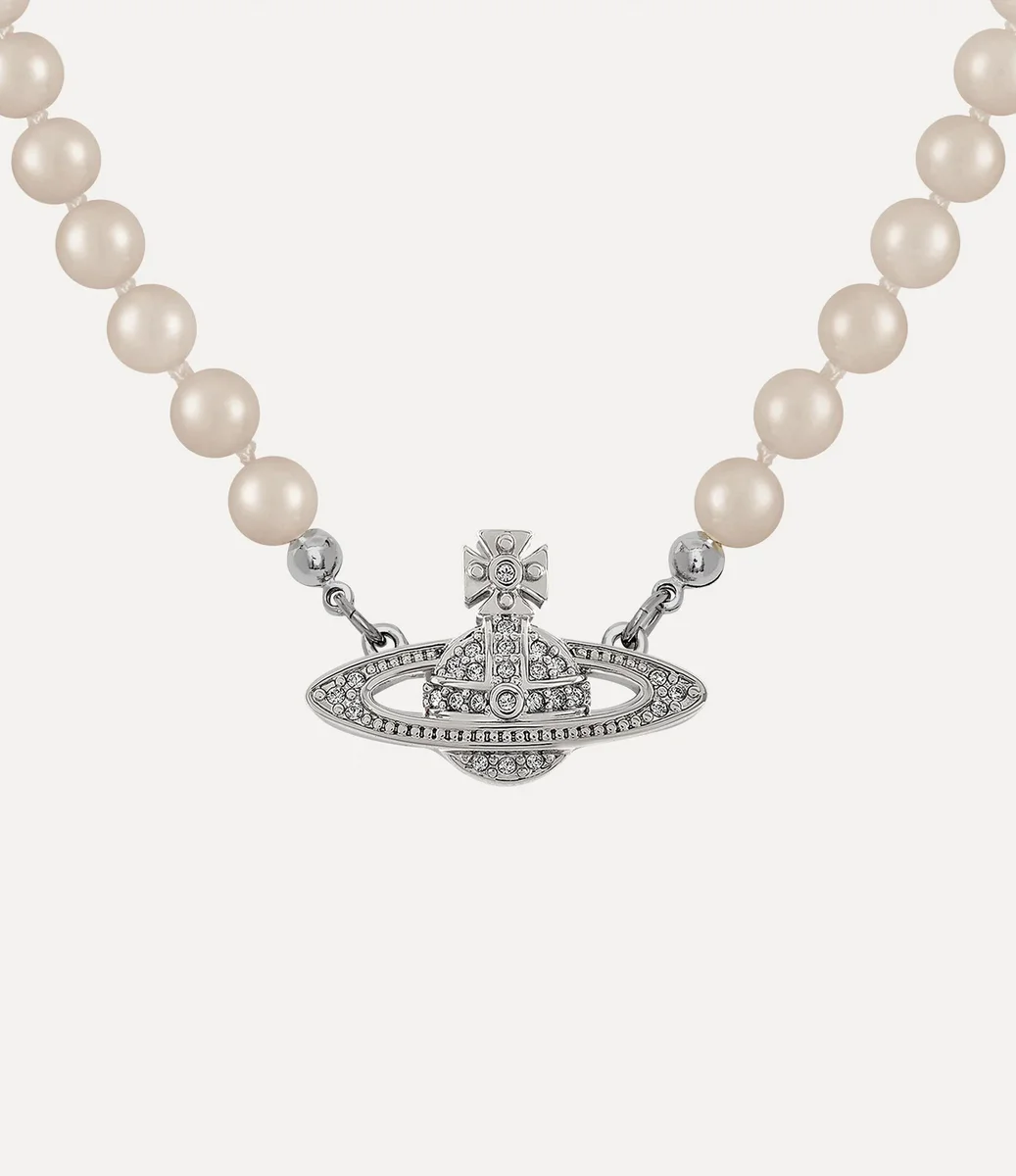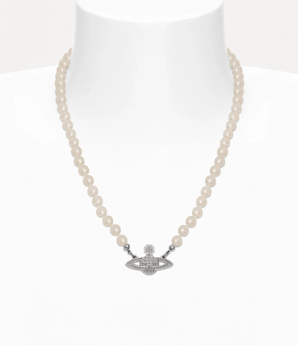 Les perles restent un élément essentiel de l’iconographie de la maison, rappelant un sentiment de luxe révolu. Le collier Man. Mini Bas Relief Pearl se compose d’une chaîne de perles en verre, complétée par un globe plat incrusté de cristaux au centre du motif, rappelant la vision de Vivienne qui consiste à propulser la tradition dans le futur.