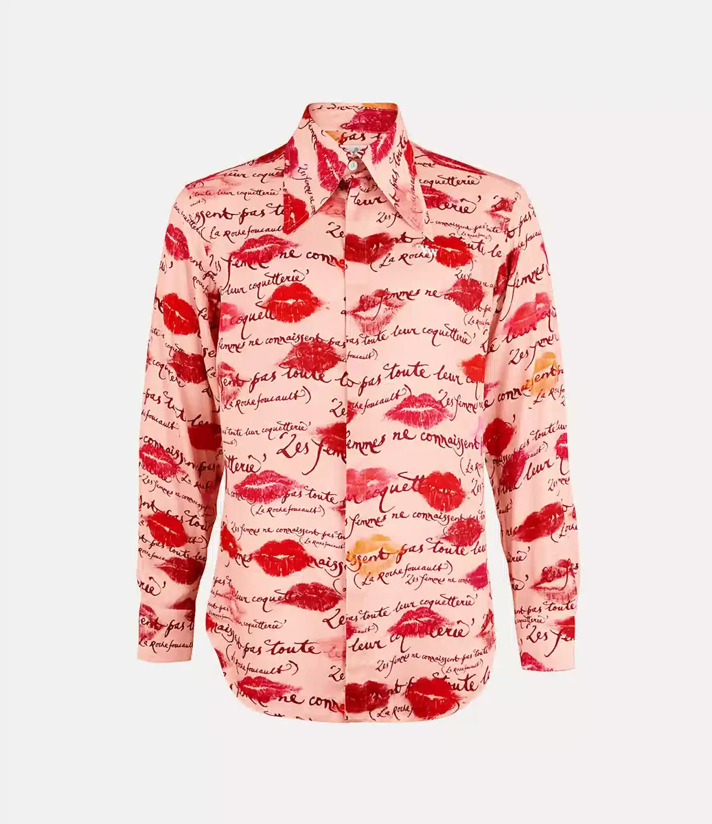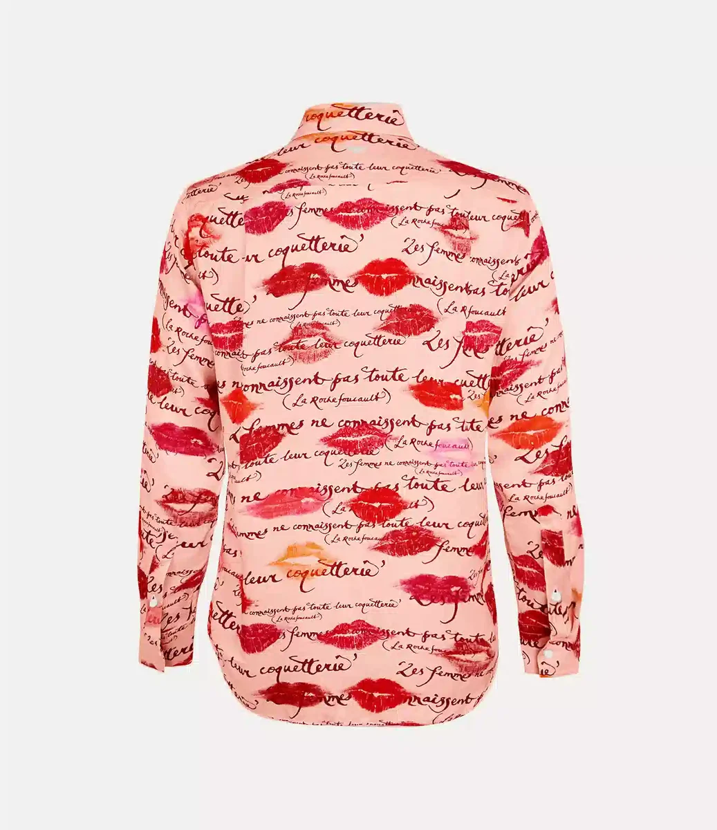 Notre chemise de smoking présente un col pointu exagéré, complété par une patte de boutonnage dissimulée. La pièce est ornée du motif « Kisses », inspiré de l’emballage de notre parfum « Boudoir », superposé au motif « Les Femmes Ne Connaissent Pas Toute Leur Coquetterie » écrit à la main par Vivienne.