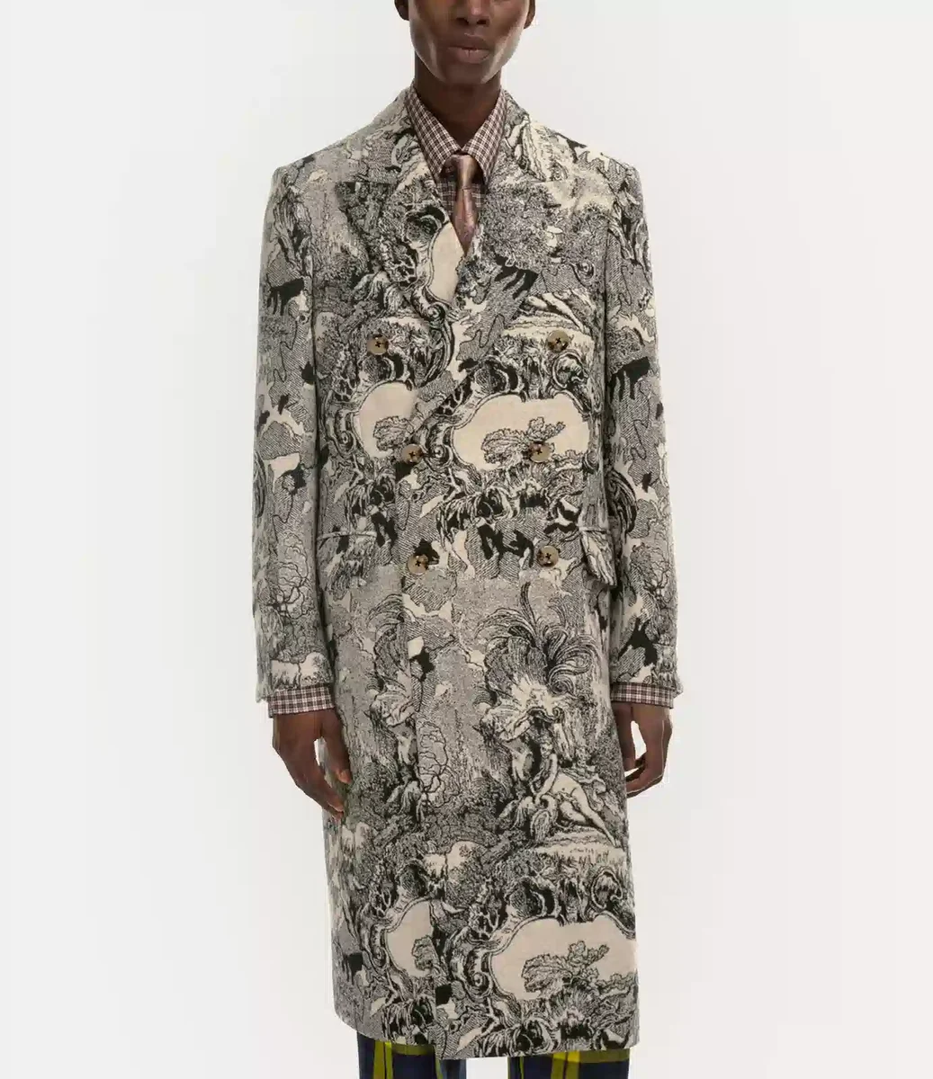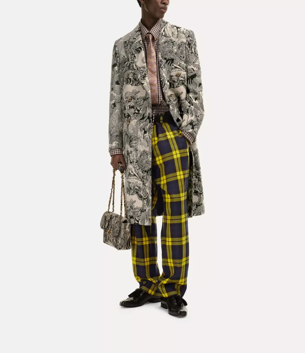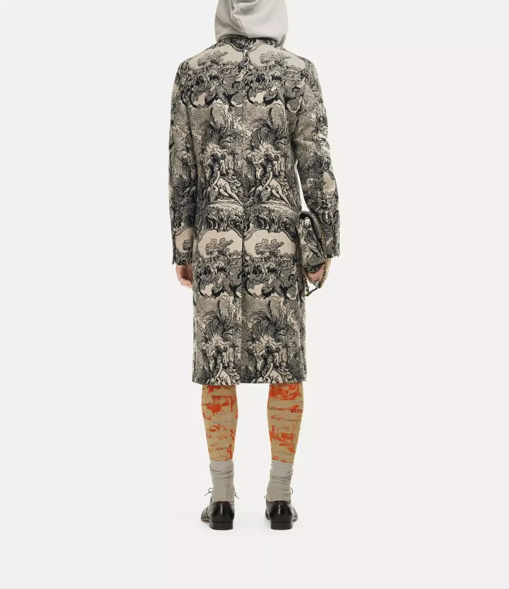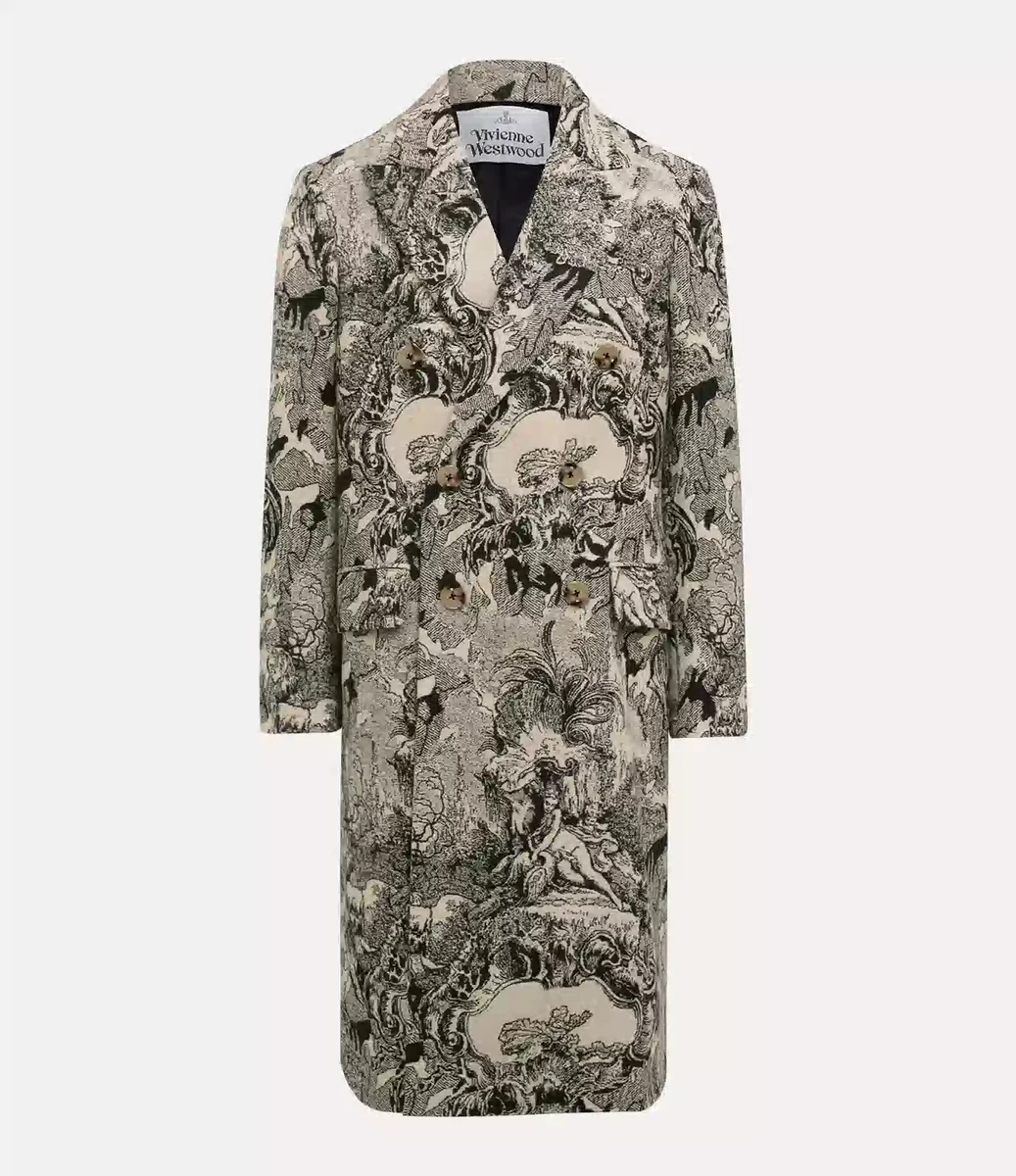 Notre manteau classique à double boutonnage est confectionné dans une riche laine brossée et présente le jacquard monochrome « Venus » de cette saison, un clin d’œil à l’admiration de Vivienne pour l’histoire de l’art. Conçu avec des épaules structurées et un large revers cranté, ce modèle présente une silhouette raffinée arrivant au genou.