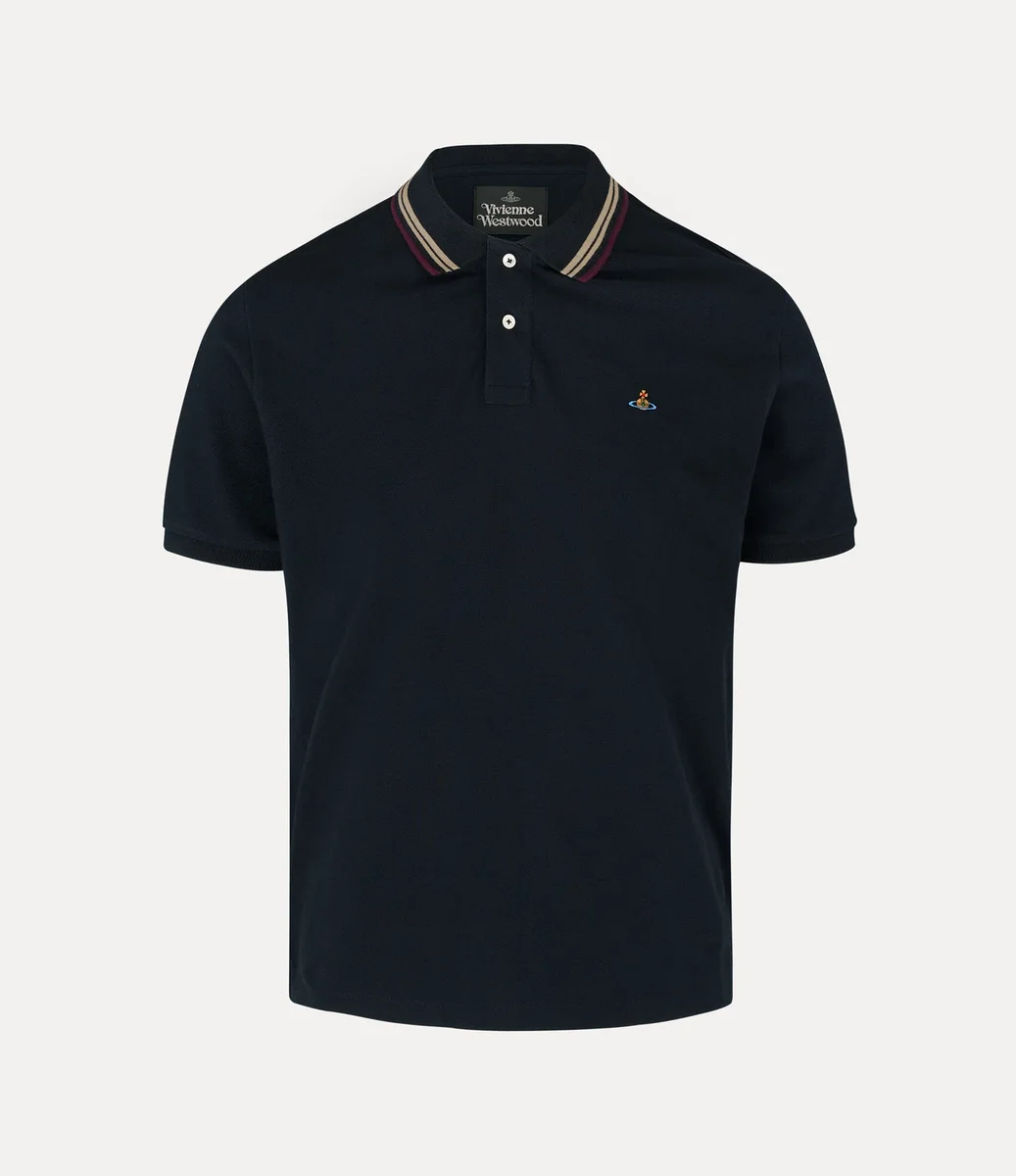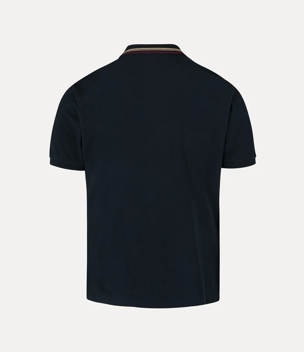 Notre polo classique a été revisité cette saison avec des boutons en nacre brillante et des détails rayés sur le col. Confectionné en coton doux, il arbore un motif orb brodé sur le côté gauche de la poitrine, symbolisant la tradition, entouré des anneaux célestes de Saturne, représentant l’avenir.