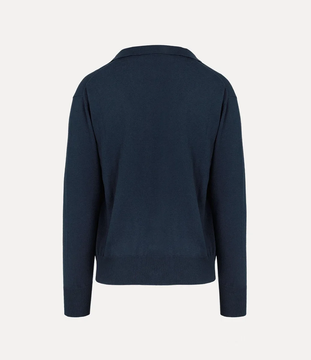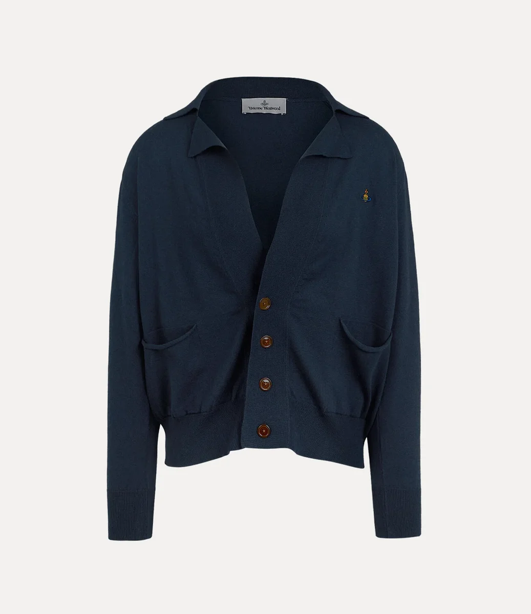 Notre cardigan Samuel présente un col plat ouvert et un décolleté en V, rehaussé d’une rangée de boutons couleur ambre sur le devant. Orné d’un globe brodé sur le côté gauche de la poitrine, ce modèle incarne la vision de Vivienne Westwood, qui consiste à faire entrer la tradition dans le futur.